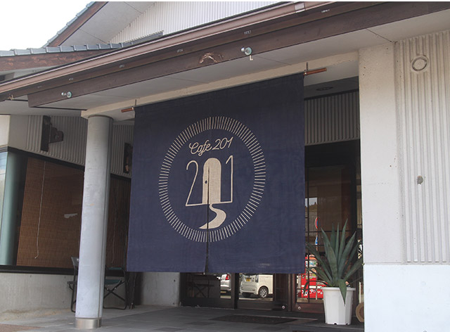 大きな暖簾にcafe201のドアをモチーフにしたロゴが目印です。
